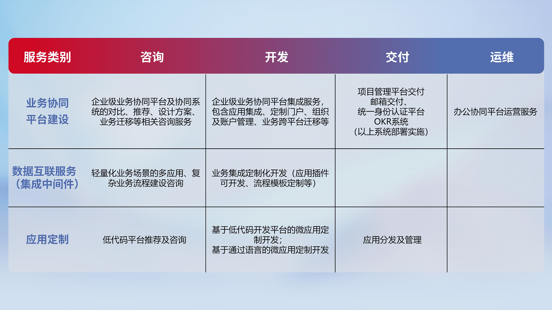 针对钉钉、、、、企微、、、IDaas等平台级产品提供产品的规划、、、、方案、、交付、、、定制化开发等服务,,实现如统一协同办公、、智能客户服务、、、、混合会议管理、、智能数据查询、、、等业务场景,,,,实现数字化转型。。