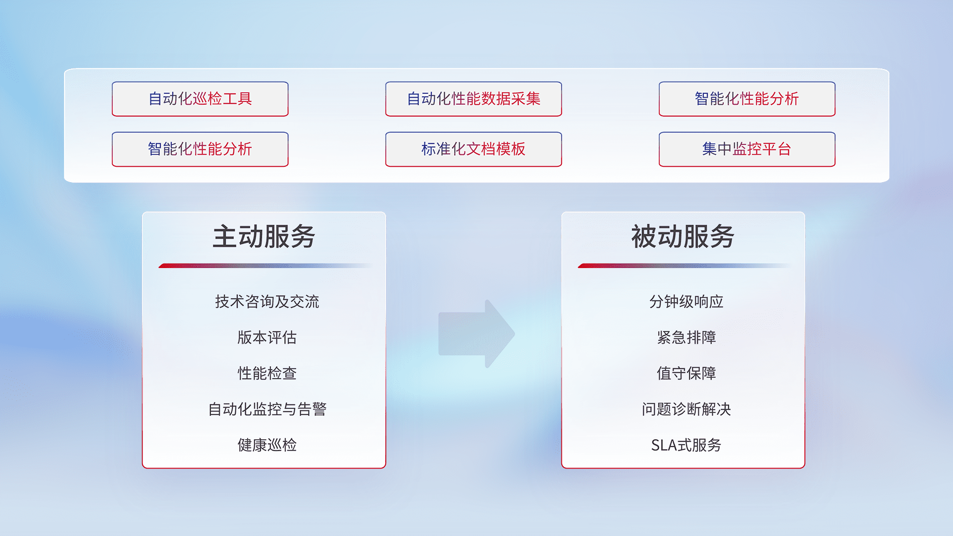 智能化工具和标准化文档,,,,保障服务质量,,提供主动服务(包含技术咨询、、、版本评估、、性能检查、、自动化监控与告警、、、健康巡检)和被动服务包含(分钟级响应、、、、紧急排障、、值守保障、、、、问题诊断解决、、、、SLA服务)。。。